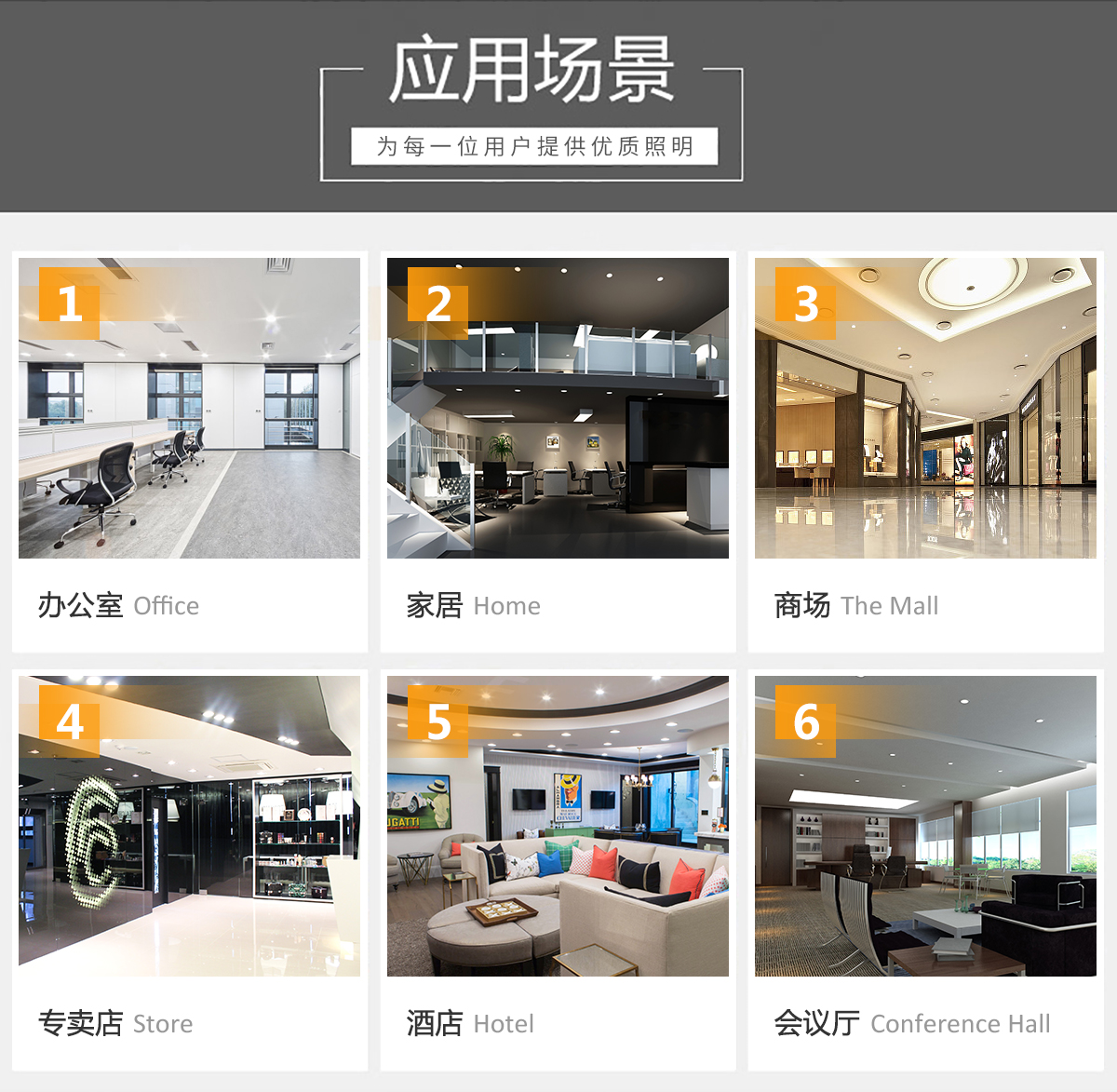 LED筒燈是一種嵌入到天花板內(nèi)光線下射式的照明燈具,光束角屬于廣角度,光線較分散均勻。LED筒燈不占據(jù)室內(nèi)空間,在室內(nèi)安裝LED筒燈,因為燈具的隱密性,不會使用產(chǎn)生壓迫的感覺,相反地會產(chǎn)生溫馨的效果。 旅館、酒店、賓館的照明運用LED筒燈等產(chǎn)品,給顧客帶來一種不一樣的感受,除了節(jié)約能源之外,還能盡顯豪華和溫馨。 起居室和家庭影院照明,利用LED筒燈的燈光色彩來烘托一種溫暖、和諧的情調(diào),體現(xiàn)舒適、休閑的氛圍。 博物館、美術陳列館等場所屬于對照明環(huán)境要求較高的特殊場合,其展示物品的特殊性要求照明光源不含紫外線,沒有熱輻射。LED筒燈是冷光源,光線中不含紫外線,完全可以滿足博物館、美術陳列館對照明的特殊要求。 會議室、多功能廳照明可以依據(jù)會議內(nèi)容的不同調(diào)整會議室或多功能廳的照明環(huán)境,嚴肅或是活潑可以自由設定,LED筒燈可以滿足不同會議主題對光環(huán)境的需求。 專賣店、商場等室內(nèi)商業(yè)氣氛照明,LED筒燈很適合烘托專賣店和商場的氣氛,LED光源能營造出其他傳統(tǒng)照明電光源所無法比擬的高品質(zhì)光環(huán)境。 其它室內(nèi)照明場所。